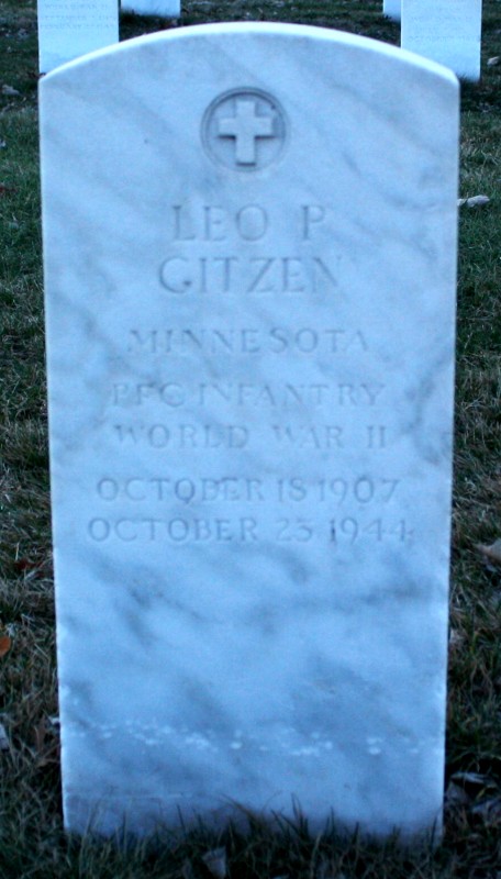 Leo P. Gitzen was born on October 18, 1907. He served in the U.S. Army during World War II as a Private First Class in the 1st Infantry Division. He died on October 23, 1944 at the age of 37 and is now buried in Fort Snelling National Cemetery, Minneapolis, Hennepin County, Minnesota, USA.