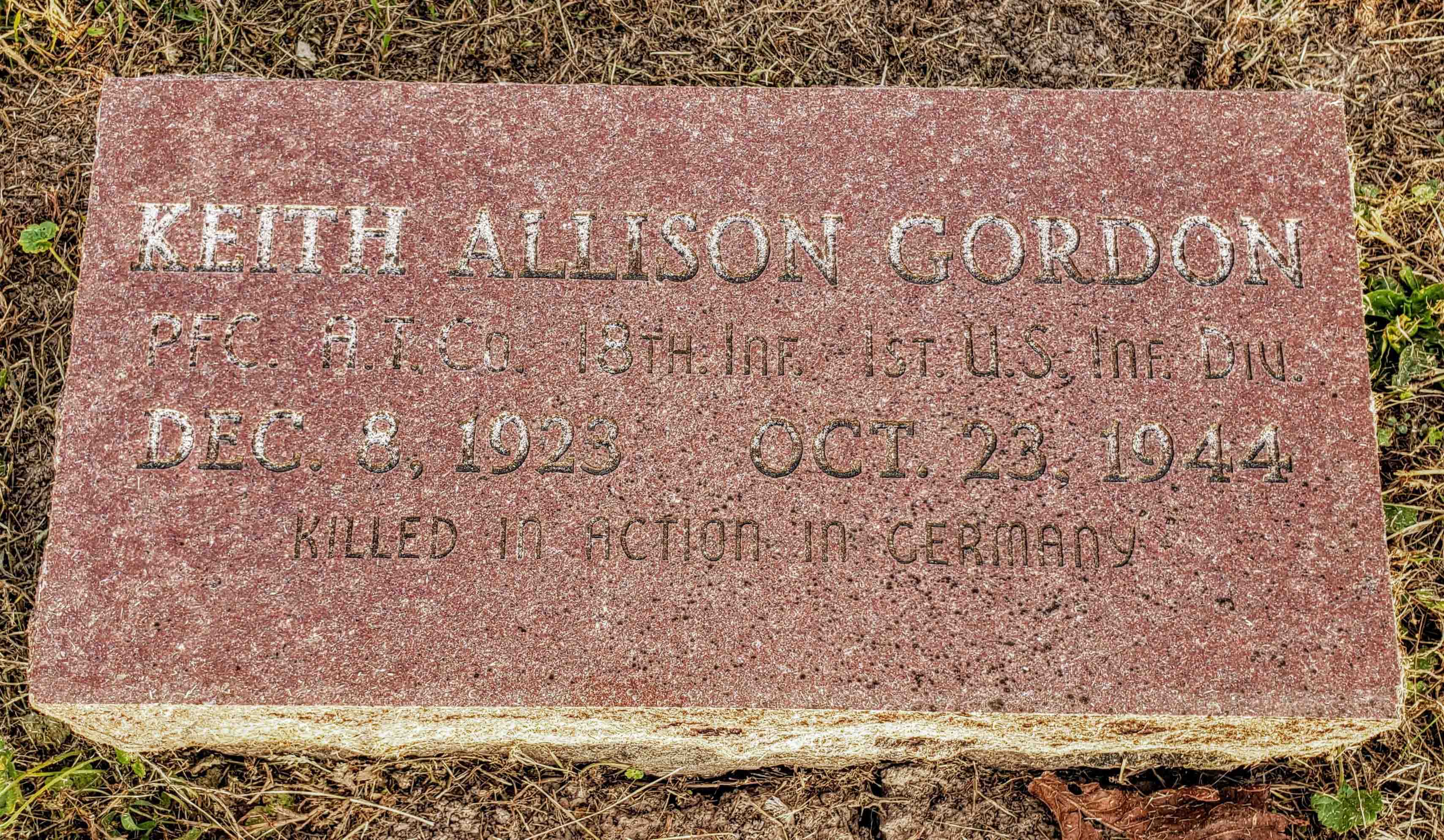 Keith A. Gordon was born in 1923 in Illinois. He was the son of Fred E. Gordon and Florence P. Allison Gordon. Keith served in the U.S. Army during World War II as a Private First Class in the 1st Infantry Division. He was Killed in Action on October 23, 1944 and is now buried in Oakwood Cemetery, Macomb, McDonough County, Illinois, USA.