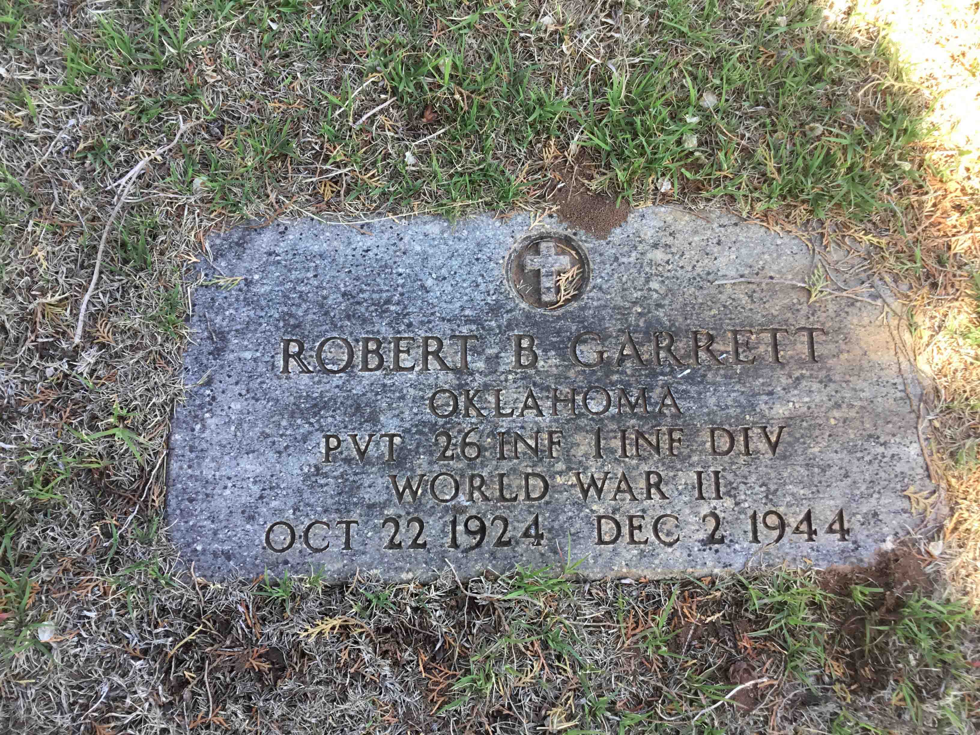 Robert B. “Ben” Garrett was born on October 22, 1924. He served in the U.S. Army during World War II as a Private in the 26th Infantry Regiment, 1st Infantry Division. He died on December 2, 1944 at the age of 20 and is now buried in Sunny Lane Cemetery, Del City, Oklahoma County, Oklahoma, USA.