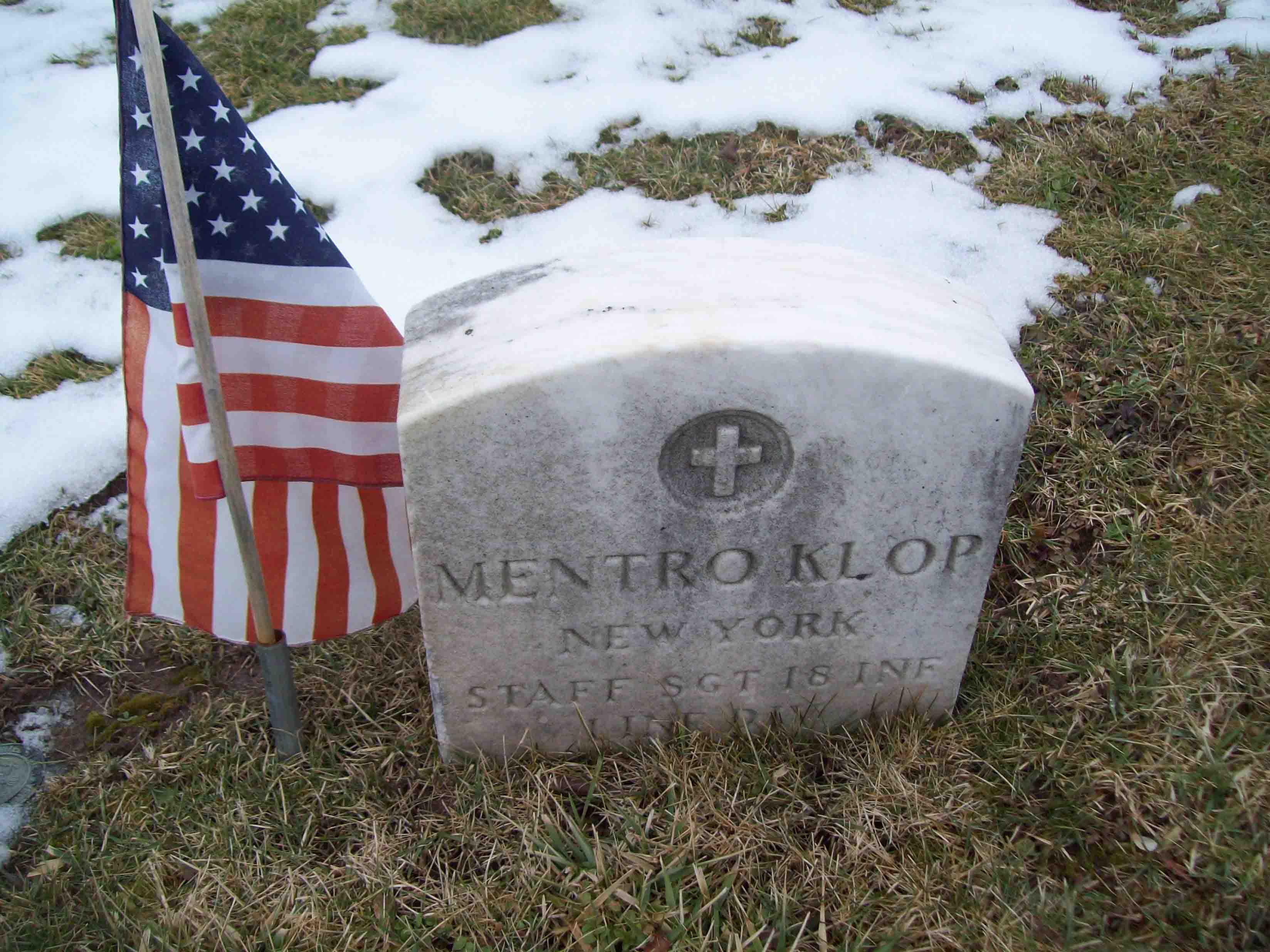 Mentro Klop was born in New York. He was the son of George Klop and Anna Gladis Klop. He served in the U.S. Army during World War II as a Staff Sergeant in the 18th Infantry Regiment, 1st Infantry Division. Mentro took part in the fighting in Tunisia, Sicily, and in the D-Day landings on Omaha Beach, France. He was Killed in Action on October 8, 1944 in Germany and is now buried in Saint Columbkille Cemetery, Seneca Falls, Seneca County, New York, USA.