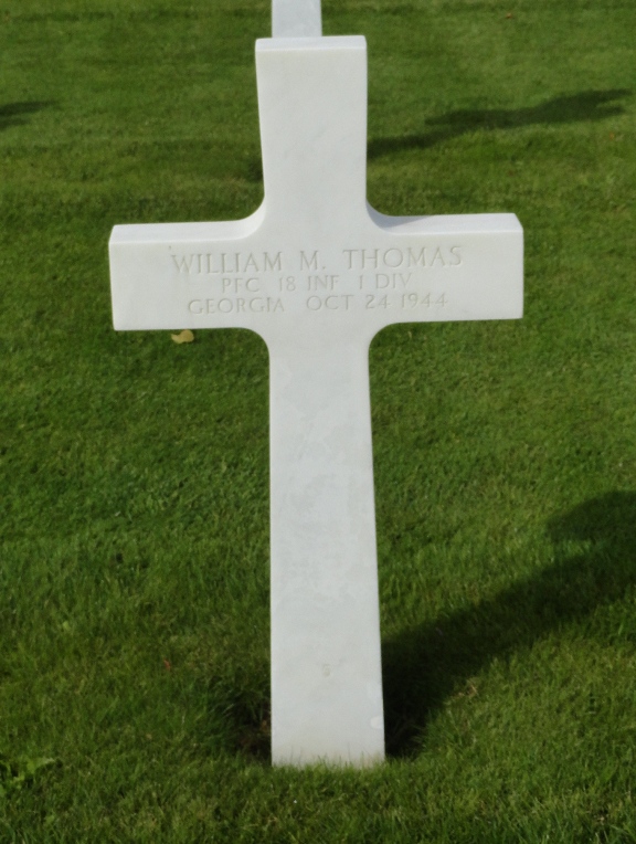 William M. Thomas entered the military service in Georgia. He served in the U.S. Army during World War II as a Private First Class in the 18th Infantry Regiment, 1st Infantry Division. He died on October 24, 1944 and is now buried in Henri-Chapelle American Cemetery, Hombourg, Belgium.