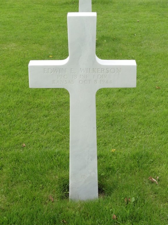 Edwin Everett Wilkerson was born in 1918 in Kansas. He served in the U.S. Army during World War II as a Private First Class in the 18th Infantry Regiment, 1st Infantry Division. He died on October 8, 1944 and is now buried in Henri-Chapelle American Cemetery, Hombourg, Belgium.