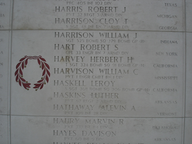 William C.Harvison entered the military service in Mississippi. He served in the U.S. Army during World War II as a Private in the 1st Engineer Combat Battalion, 1st Infantry Division. He died on October 12, 1944 but was declared Missing in Action and is memorialized on Tablets of the Missing, Netherlands American Cemetery and Memorial, Margraten, Eijsden-Margraten Municipality, Limburg, Netherlands.