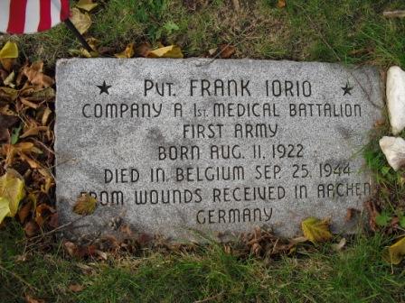 Frank Iorio was born on August 11, 1922. He served in the U.S. Army during World War II as a Private in Company A, 1st Medical Battalion, 1st Infantry Division. He died from his wounds received in battle on September 25, 1944 in Aachen, Germany at the age of 22 and is now buried in Our Lady Of Lourdes Cemetery, Trenton, Mercer County, New Jersey, USA.