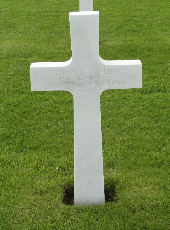 Donald Vincent Hart was born on September 8, 1916 in Ralston, Pawnee County, Oklahoma. He was the son of Edward Cottingham Hart and Ila Lee Thorpe Hart. Donald served in the U.S. Army during World War II as a Private in the 26th Infantry Regiment, 1st Infantry Division. He died on November 29, 1944 in Belgium at the age of 28 and is now buried in Henri-Chapelle American Cemetery, Hombourg, Belgium.