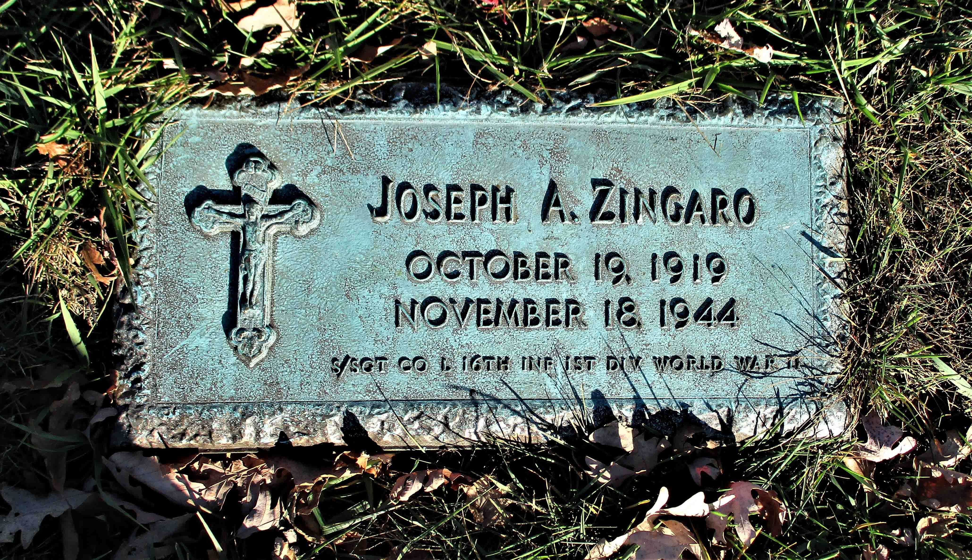 Joseph A. Zingaro was born on October 19, 1918. He served in the U.S. Army during World War II as a Staff Sergeant in Company L, 16th Infantry Regiment, 1st Infantry Division. He died on November 18, 1944 at the age of 26 and is now buried in Saint Mary's Cemetery, Beaver Falls, Beaver County, Pennsylvania, USA.