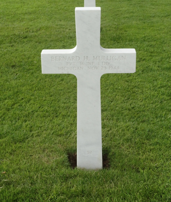 Bernard H. Mulligan entered the military service in Michigan. He served in the U.S. Army during World War II as a Private in the 16th Infantry Regiment, 1st Infantry Division. He died on November 23, 1944 and is now buried in Henri-Chapelle American Cemetery, Hombourg, Belgium.