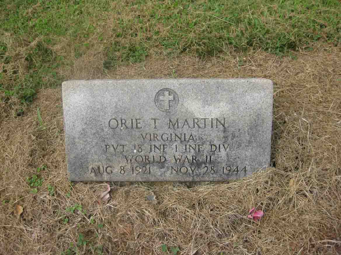 Orie Thomas Martin was born on August 8, 1921 in Bedford County, Virginia. He was the son of Roscoe Ray Martin and Elsie Mae Payne Martin. Orie served in the U.S. Army during World War II as a Private in the 18th Infantry Regiment, 1st Infantry Division. He died on November 28, 1944 in Germany at the age of 23 and is now buried in Martin-Ashwell Cemetery, Huddleston, Bedford County, Virginia, USA.