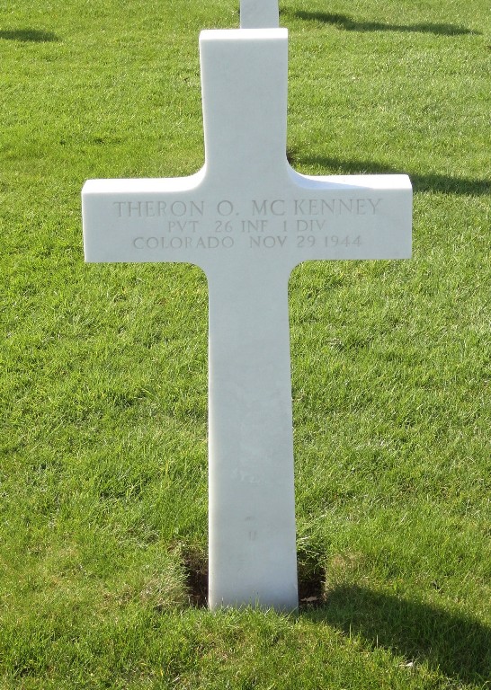 Theron O. McKenney entered the military service in Colorado. He served in the U.S. Army during World War II as a Private in the 26th Infantry Regiment, 1st Infantry Division. He died on November 29, 1944 and is now buried in Henri-Chapelle American Cemetery, Hombourg, Belgium.