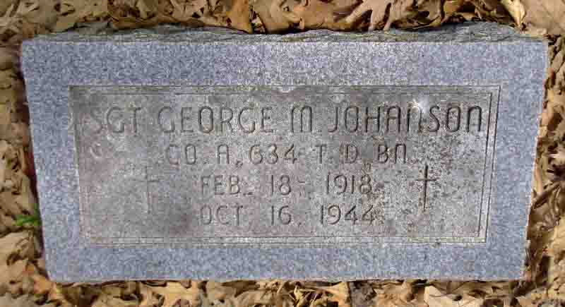 George M. Johanson was born on February 18, 1918. He was the son of Gust Johanson and Martha Johanson. George served in the U.S. Army during World War II as a Sergeant in Company A, 634th Tank Destroyer Battalion. He died on October 16, 1944 at the age of 26 and is now buried in Riverside Cemetery, Marshalltown, Marshall County, Iowa, USA.