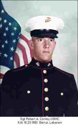 Robert Allen “Bobby” Conley was born on September 15, 1961. He served in the United States Marine Corps as a Sergeant. He was killed in the terrorist bombing of the United States Marine barracks. In the early morning hours of 23 Oct. 1983, a truck loaded with explosives crashed through the security perimeter of the USMC Barracks in Beirut, Lebanon. In the explosion that followed, 241 US Military personnel were killed and 80 serious wounded. His current burial place is unknown.