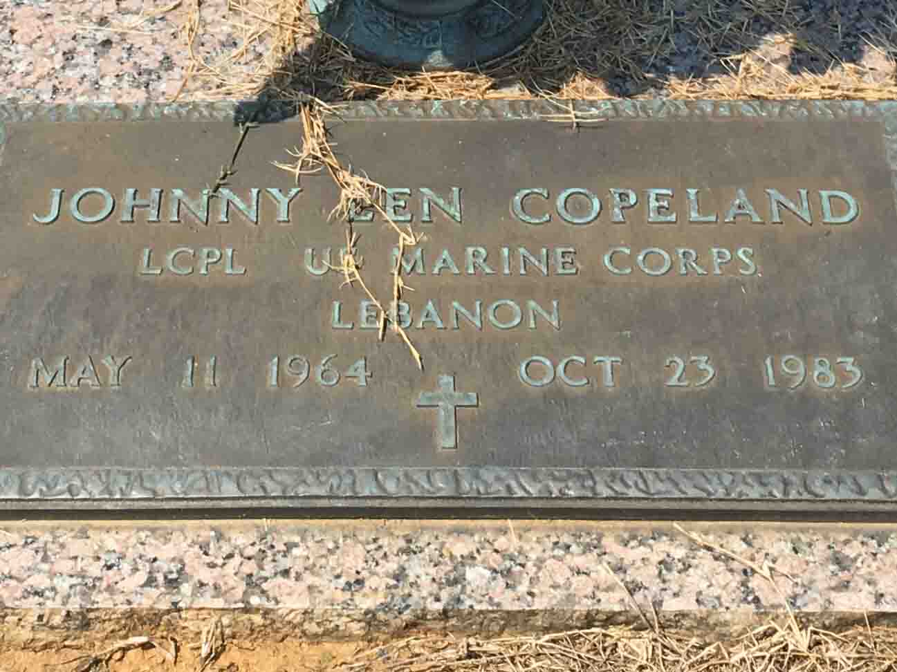 Johnny Len Copeland was born on May 11, 1964 in Burlington, Alamance County, North Carolina. He served in the United States Marine Corps as a Lance Corporal. Johnny was killed in the terrorist bombing of the United States Marine barracks. In the early morning hours of 23 Oct. 1983, a truck loaded with explosives crashed through the security perimeter of the USMC Barracks in Beirut, Lebanon. In the explosion that followed, 241 US Military personnel were killed and 80 serious wounded. He is now buried in the Graham Memorial Park, Graham, Alamance County, North Carolina, USA.
