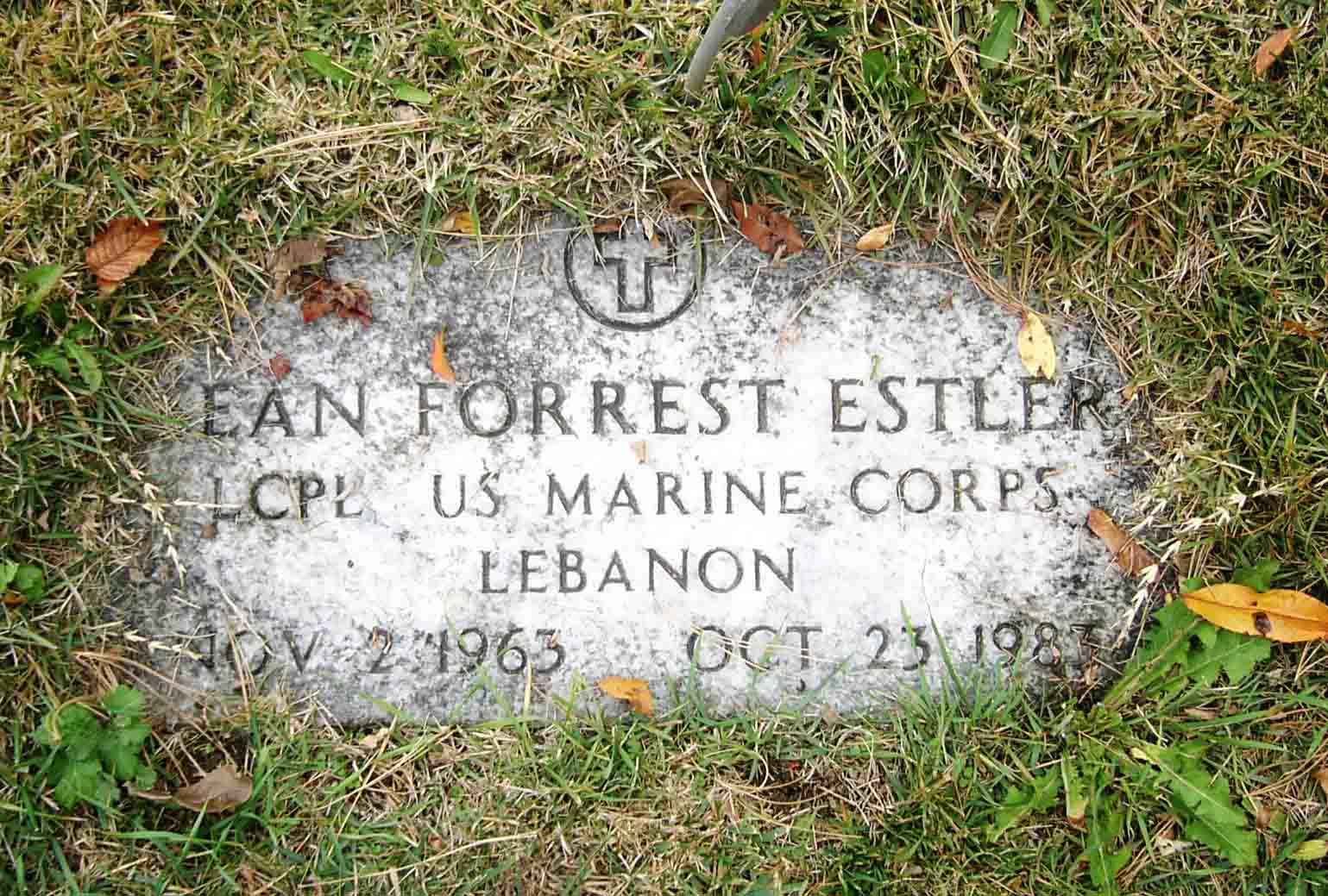 Sean Forrest Estler was born on November 2, 1963 in New Brunswick, Middlesex County, New Jersey. He graduated from South Brunswick High School in 1982, where he was active as a member of the Outdoor Club, a member of the junior varsity football team, and a member of the band. Cpl. Estler was a member of Troop 90 Boy Scouts sponsored by the Community Presbyterian Church of the Sand Hills, Kendall Park, and in 1981, he was the first member of the church to receive his Eagle award. Sean died from his wounds in the terrorist bombing of the United States Marine barracks. In the early morning hours of 23 Oct. 1983, a truck loaded with explosives crashed through the security perimeter of the USMC Barracks in Beirut, Lebanon. In the explosion that followed, 241 US Military personnel were killed and 80 serious wounded. He is now buried in the Dayton Cemetery, Dayton, Middlesex County, New Jersey, USA.