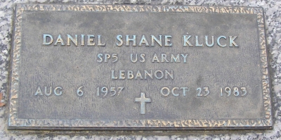 Daniel Shane Kluck was born on August 6, 1957 in Owensboro, Daviess County, Kentucky. He was graduated from Owensboro High School in 1976 and entered the U.S. Army the same year. He had a 2-year tour of duty in Germany, received Good Conduct medals and was an expert rifleman and a radar repairman. He was a member of St. Stephen Cathedral. Daniel served in the United States Marine Corps as a Specialist 5th Class. He was killed in the terrorist bombing of the United States Marine barracks. In the early morning hours of 23 Oct. 1983, a truck loaded with explosives crashed through the security perimeter of the USMC Barracks in Beirut, Lebanon. In the explosion that followed, 241 US Military personnel were killed and 80 serious wounded. He is now buried in the Owensboro Memorial Gardens, Owensboro, Daviess County, Kentucky, USA.