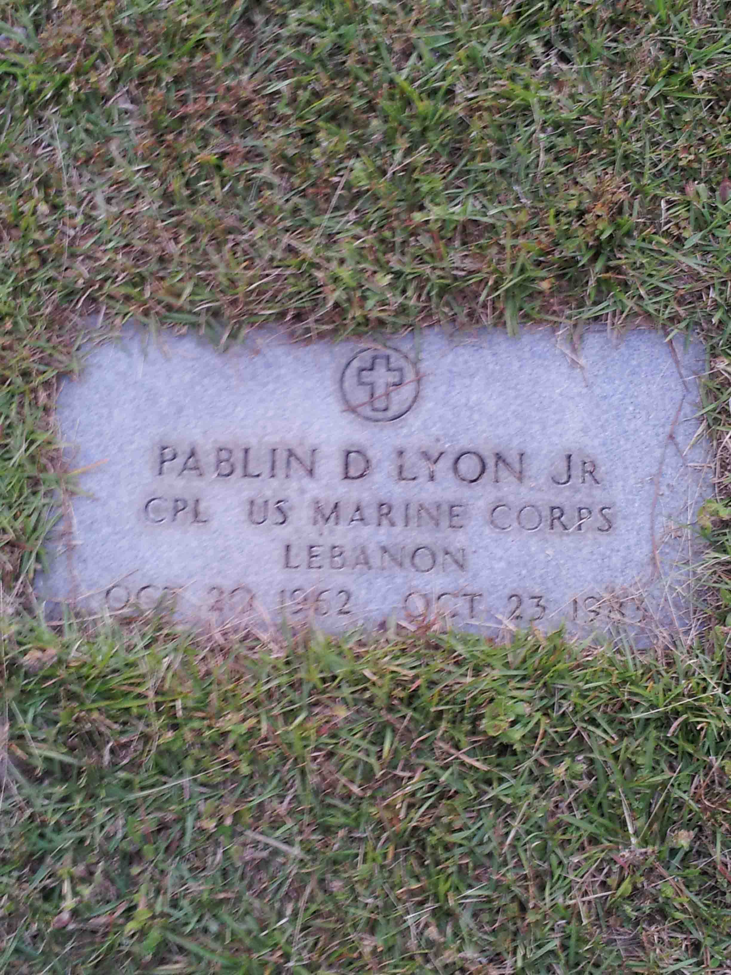 Paul Dean Lyon, Jr. was born on October 20, 1962 in Rota, Provincia de Cádiz, Andalucia, Spain. He served in the United States Marine Corps as a Lance Corporal. Paul was killed in the terrorist bombing of the United States Marine barracks. In the early morning hours of 23 Oct. 1983, a truck loaded with explosives crashed through the security perimeter of the USMC Barracks in Beirut, Lebanon. In the explosion that followed, 241 US Military personnel were killed and 80 serious wounded. He is now buried in the Serenity Gardens, Milton, Santa Rosa County, Florida, USA. His headstone shows his rank as a Corporal.