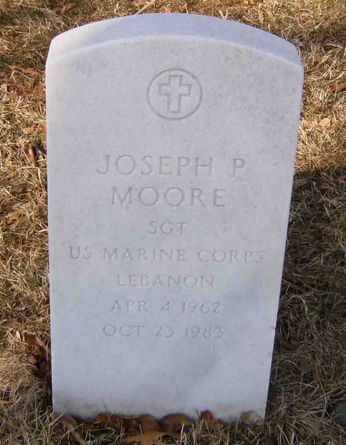 Joseph P. Moore was born on April 4, 1962. He served in the United States Marine Corps as a Corporal. He was killed in the terrorist bombing of the United States Marine barracks. In the early morning hours of 23 Oct. 1983, a truck loaded with explosives crashed through the security perimeter of the USMC Barracks in Beirut, Lebanon. In the explosion that followed, 241 US Military personnel were killed and 80 serious wounded. He is now buried in the Jefferson Barracks National Cemetery, Lemay, St. Louis County, Missouri, USA. His headstone shows his rank as a Sergeant.