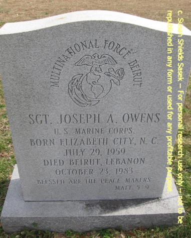 Joseph Albert Owens was born on jul 29, 1959 in Elizabeth City, Pasquotank County, North Carolina. He served in the United States Marine Corps as a Corporal. Joseph was killed in the terrorist bombing of the United States Marine barracks. In the early morning hours of 23 Oct. 1983, a truck loaded with explosives crashed through the security perimeter of the USMC Barracks in Beirut, Lebanon. In the explosion that followed, 241 US Military personnel were killed and 80 serious wounded. He is now buried in the Salem Baptist Church Cemetery, Courthouse Green, Chesterfield County, Virginia, USA. His headstone shows his rank as a Sergeant.