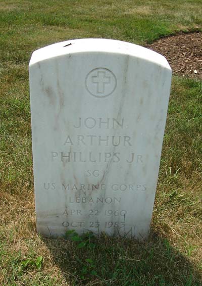 John Arthur Phillips, Jr. was born on April 22, 1960 in La Crosse, La Crosse County, Wisconsin. He served in the United States Marine Corps as a Sergeant. John was killed in the terrorist bombing of the United States Marine barracks. In the early morning hours of 23 Oct. 1983, a truck loaded with explosives crashed through the security perimeter of the USMC Barracks in Beirut, Lebanon. In the explosion that followed, 241 US Military personnel were killed and 80 serious wounded. He is now buried in the Arlington National Cemetery, Arlington, Arlington County, Virginia, USA.