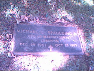 Michael C. Spaulding, Jr. was born on December 25, 1961 in Ohio. He served in the United States Marine Corps as a Lance Corporal. Michael was killed in the terrorist bombing of the United States Marine barracks. In the early morning hours of 23 Oct. 1983, a truck loaded with explosives crashed through the security perimeter of the USMC Barracks in Beirut, Lebanon. In the explosion that followed, 241 US Military personnel were killed and 80 serious wounded. He is now buried in the Mount Peace Cemetery, Akron, Summit County, Ohio, USA. His headstone shows his rank as a Corporal.