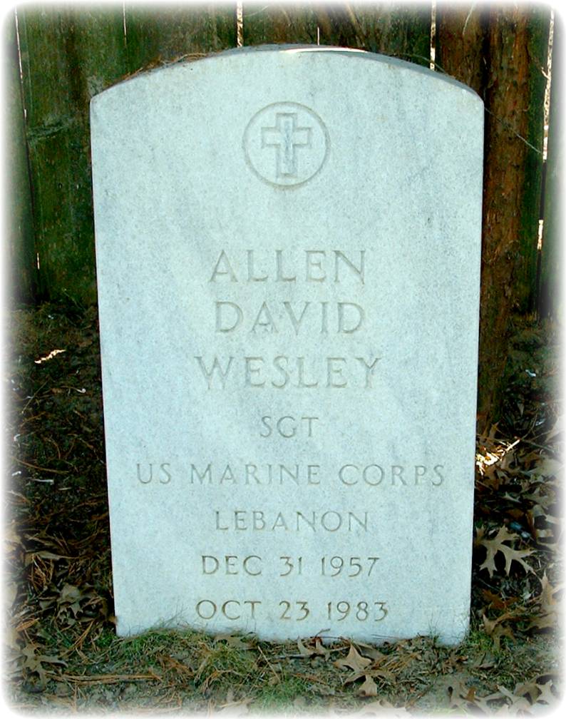 Allen David Wesley was born on December 31, 1957 in Philadelphia, Philadelphia County, Pennsylvania. He served in the United States Marine Corps as a Sergeant. Allen was killed in the terrorist bombing of the United States Marine barracks. In the early morning hours of 23 Oct. 1983, a truck loaded with explosives crashed through the security perimeter of the USMC Barracks in Beirut, Lebanon. In the explosion that followed, 241 US Military personnel were killed and 80 serious wounded. He is now buried in the Beverly National Cemetery, Beverly, Burlington County, New Jersey, USA.