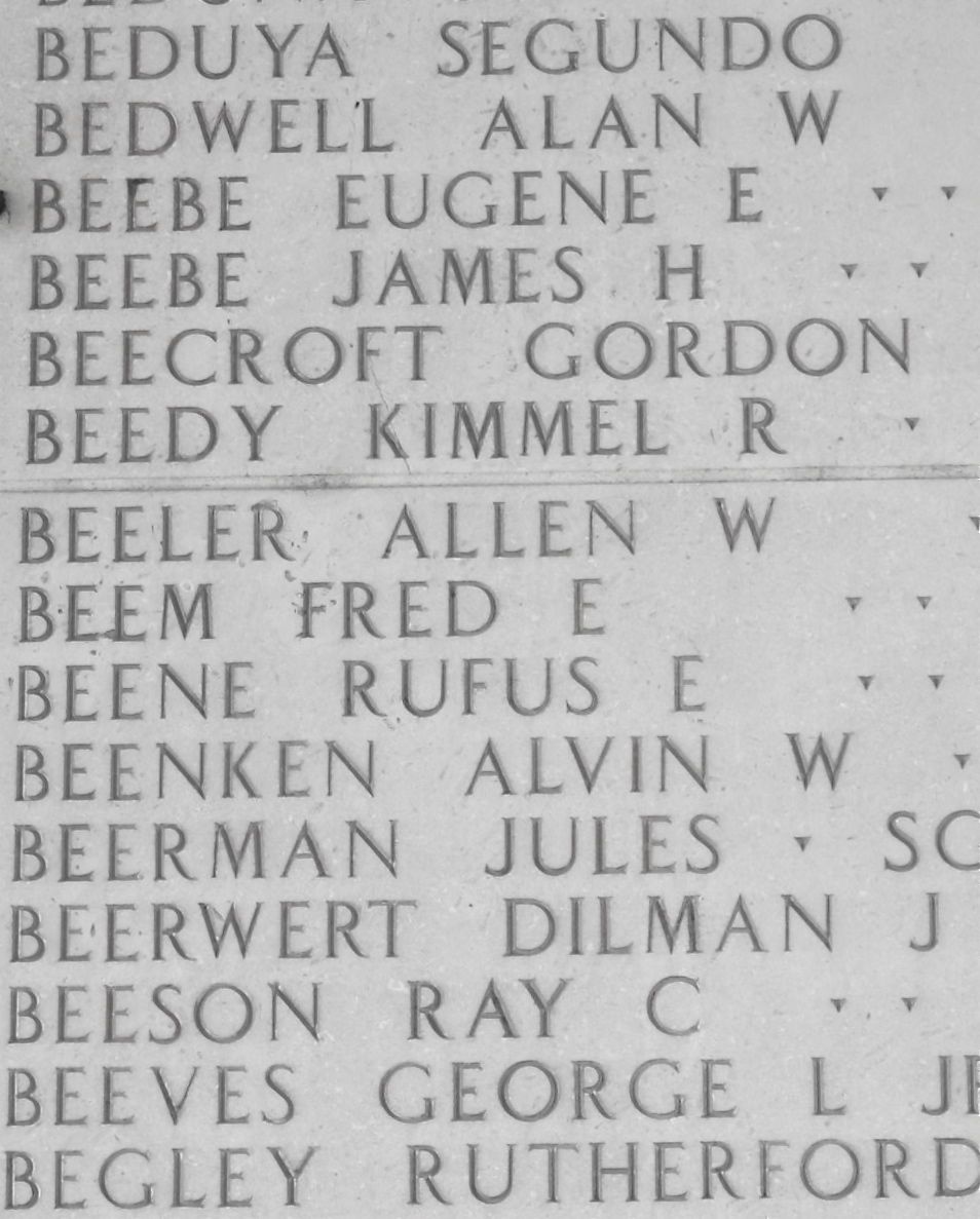Rufus S. Beene, aged 28, was born on November 20, 1915. He entered the military service in Arkansas and served in the 1327th Army Air Force Base Unit as a Second Lieutenant and Co-Pilot Server of an aircraft during World War II. He was declared "Missing in Action" on November 13, 1944 and is commemorated on the Walls of the Missing, Manila American Cemetery, Taguig City, Philippines. He also has a cenotaph located in Nashville Cemetery, Nashville, Howard County, Arkansas, USA.