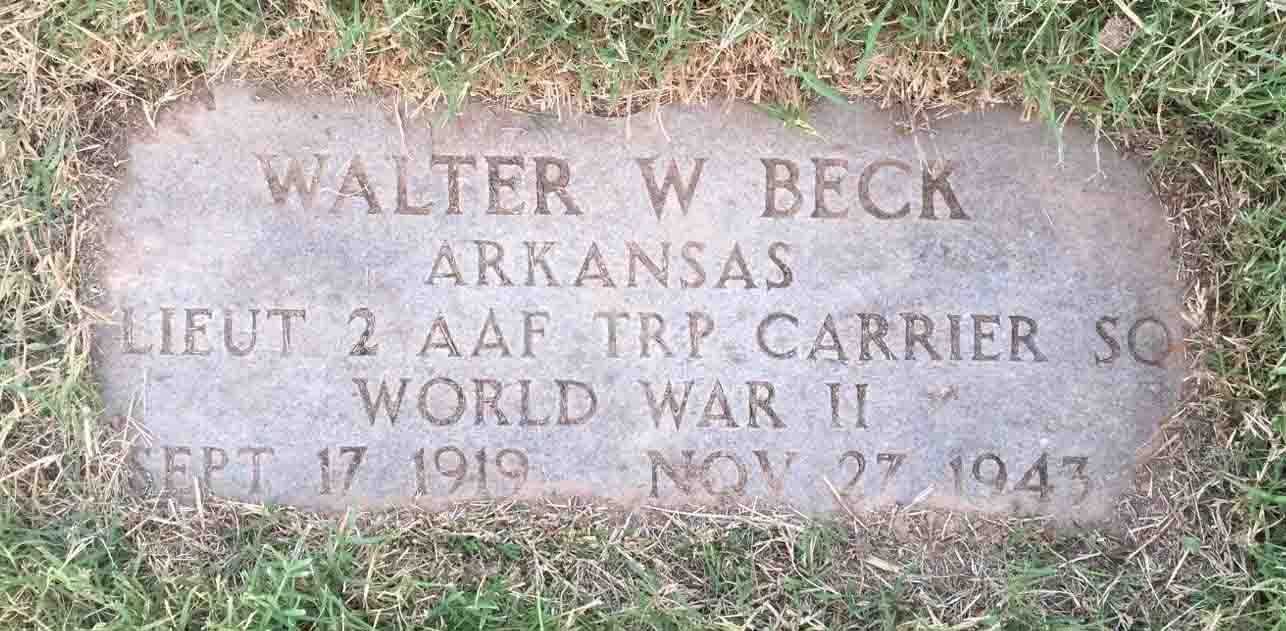 Walter W. Beck was born on September 17, 1919. He served in the 2nd Troop Carrier Squadron as a Second Lieutenant. He was a passenger of an aircraft when he died on November 27, 1943 at the age of 24. He is now buried in the Lone Tree Cemetery, Stuttgart, Arkansas County, Arkansas, USA. He was one of over 2000 Americans who lost their lives defending China from their Japanese invaders from 1941-1945. He is commemorated on the The Monument to the Aviation Martyrs in the War of Resistance Against Japan in Nanjing, China but death date is inscribed as 1943-11-12.