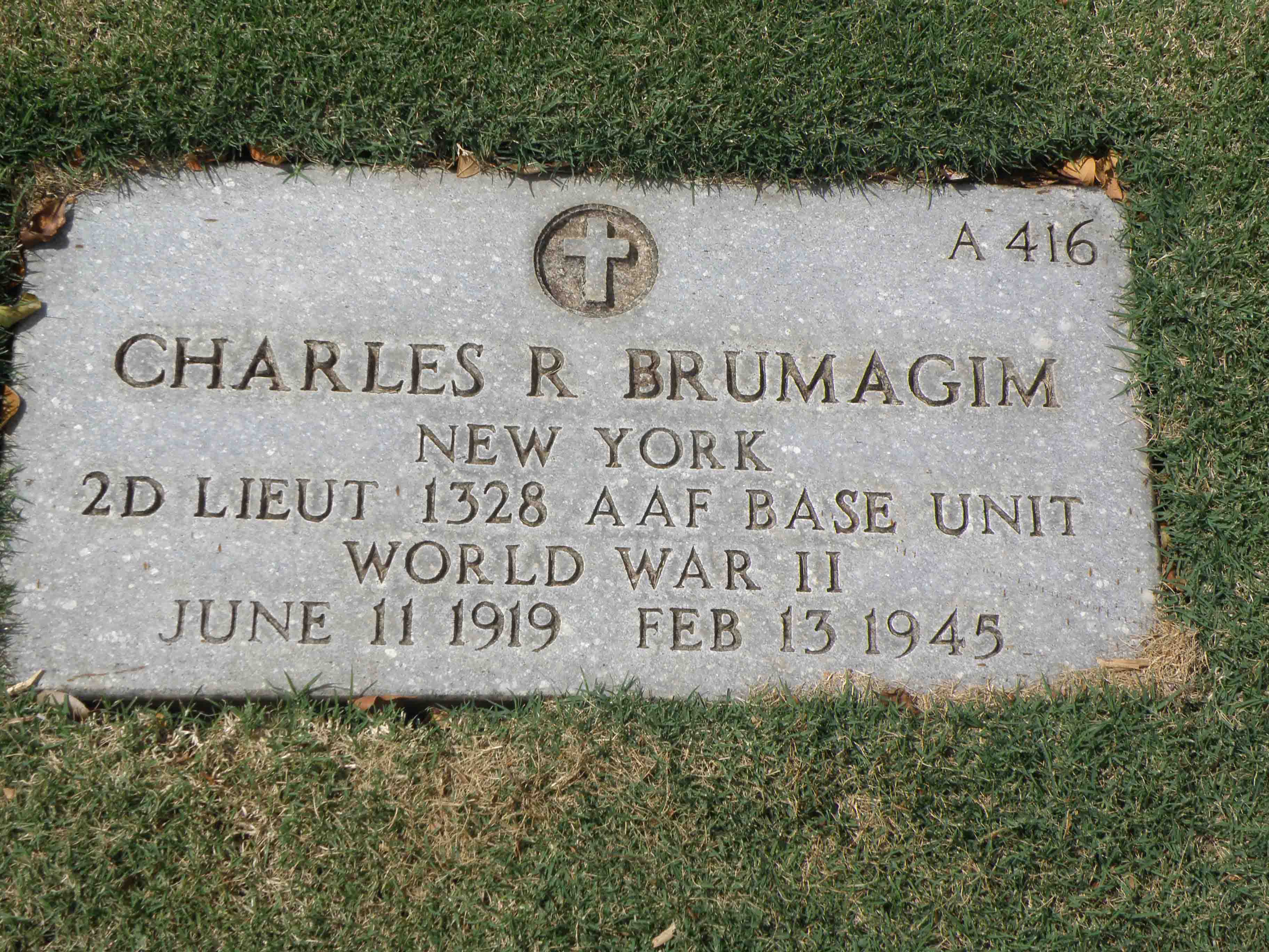 Charles Brumagim, aged 25, was born on June 11, 1919. He resided in Erie County, New York prior to the war. Charles served as a Second Lieutenant and Co-Pilot on C-46 #42-96746, 1328th Base Unit, U.S. Army Air Force during World War II. Charles died in the "Line Of Duty" when his C-46 crashed in Singapore after taking off from the Chanyi Air Base during the war. He was originally interred in Schofield Barracks and was later re-interred in National Memorial Cemetery of the Pacific, Honolulu, Honolulu County, Hawaii on January 24, 1949.