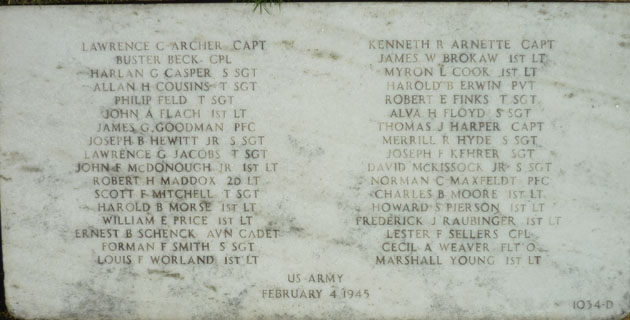 James G. Goodman was a Private First Class during World War II. On February 4, 1945, PFC Goodman was a passenger aboard C-46A #42-107386 aircraft on a transfer mission. This C46 with a crew of two and 33 passengers departed Chabua Air base in India for Karachi in Pakistan. While flying over remote Jungle terrain they developed mechanical problems caught fire and crashed on mountain elevation of 6559 feet killing 35. Twenty two of the passengers were in the 22nd Bomb Squadron, 341st Bomb Group being sent home for reassignment. Miraculously there was 1 survivor T/Sgt. Marvin H. Jacobs. He walked away with minor cuts and bruises and was soon rescued by locals and repatriated to the US. The casualties were eventually located and buried in a mass grave at Jefferson Barracks National Cemetery in 1950.