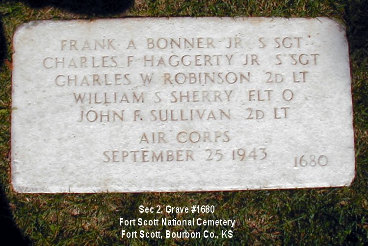 Charles F. Haggerty, Jr. served in the US Air Corps as a Staff Sergeant and Engineer/Gunner of an aircraft during World War II. He died on September 25, 1943 and is now buried in the Fort Scott National Cemetery, Fort Scott, Bourbon County, Kansas, USA in a common grave with his crew. Charles was one of over 2000 Americans who lost their lives defending China from their Japanese invaders from 1941-1945. He is commemorated on the The Monument to the Aviation Martyrs in the War of Resistance Against Japan in Nanjing, China but hid middle name's initial is inscribed as E.