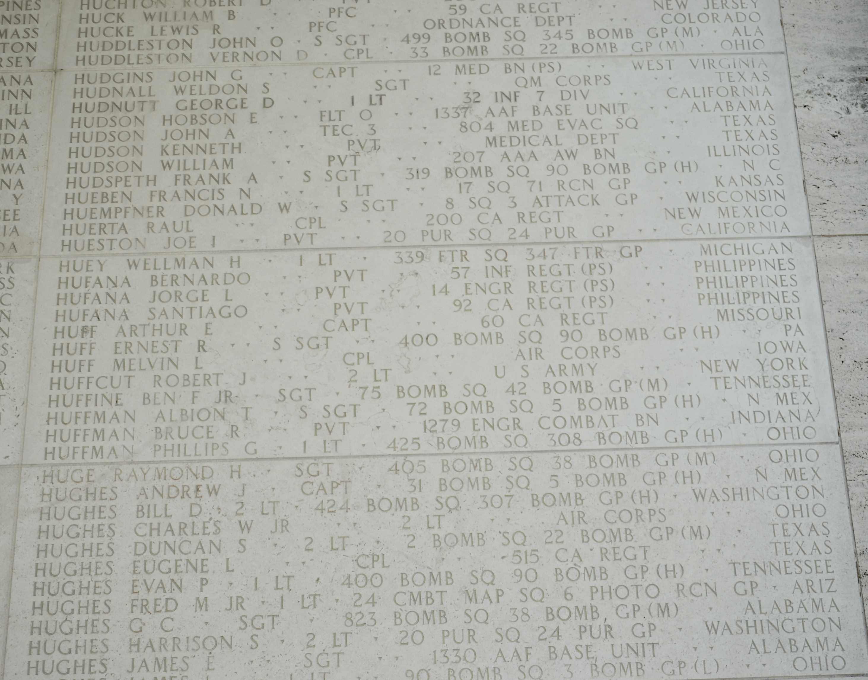 Hobson E. Hudson was born in 1912. He was the son of Eugene W. Hudson and Frances E. Hudson. Hobson entered the military service in Alabama and served in the 1337th Army Air Force as a Flight Officer and Co-Pilot of an aircraft during World War II. He was declared "Missing in Action" on April 5, 1945 and is commemorated on the Walls of the Missing, Manila American Cemetery, Taguig City, Philippines. He also has a cenotaph located in Bethabara Cemetery, Berry, Fayette County, Alabama, USA. He was one of over 2000 Americans who lost their lives defending China from their Japanese invaders from 1941-1945. He is commemorated on the The Monument to the Aviation Martyrs in the War of Resistance Against Japan in Nanjing, China.