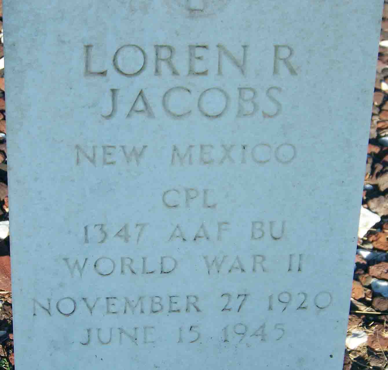 Loren R. Jacobs was born on November 27, 1920 in Union County, New Mexico. He was the son of Clarence Winfield Jacobs and Lula Estella Mantz Jacobs. He served in the 1347th Army Air Force Base Unit as a Corporal and Navigator of an aircraft during World War II. Loren died in a non-combat incident in India on June 15, 1945 at the age of 24. He is now buried in the Clayton Cemetery, Clayton, Union County, New Mexico, USA.