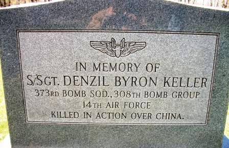 Denzil Byron Keller was born on February 13, 1924 in Belington, Barbour County, West Virginia. He served in the 373rd Bomber Squadron, 308th Bomber Group, Heavy as a Sergeant and Engineer on a bomber plane during World War II. He was Killed in Action on May 12, 1945 in China at the age of 21 and is now buried in the Belington Fraternal Cemetery, Belington, Barbour County, West Virginia, USA. He was one of over 2000 Americans who lost their lives defending China from their Japanese invaders from 1941-1945. He is commemorated on the The Monument to the Aviation Martyrs in the War of Resistance Against Japan in Nanjing, China.