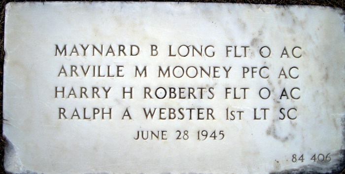 Arville M. Mooney served in the US Air Corps as a Private First Class and Radio Operator of an aircraft during World War II. He died on June 28, 1945 and is now buried in the Jefferson Barracks National Cemetery, Lemay, St. Louis County, Missouri, USA in a common grave with his crew. Arville was one of over 2000 Americans who lost their lives defending China from their Japanese invaders from 1941-1945. He is commemorated on the The Monument to the Aviation Martyrs in the War of Resistance Against Japan in Nanjing, China but death date is inscribed as 1945-06-27.