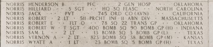 Robert E. Norris entered the military service in Oklahoma. He served in the 78th Transport Squadron, 22nd Air Transport Group as a Flight Officer and Pilot of an aircraft during World War II. He was declared "Missing in Action" on July 3, 1943 and is commemorated on the Walls of the Missing, Manila American Cemetery, Taguig City, Philippines. F/O Norris was one of over 2000 Americans who lost their lives defending China from their Japanese invaders from 1941-1945. He is commemorated on the The Monument to the Aviation Martyrs in the War of Resistance Against Japan in Nanjing, China.