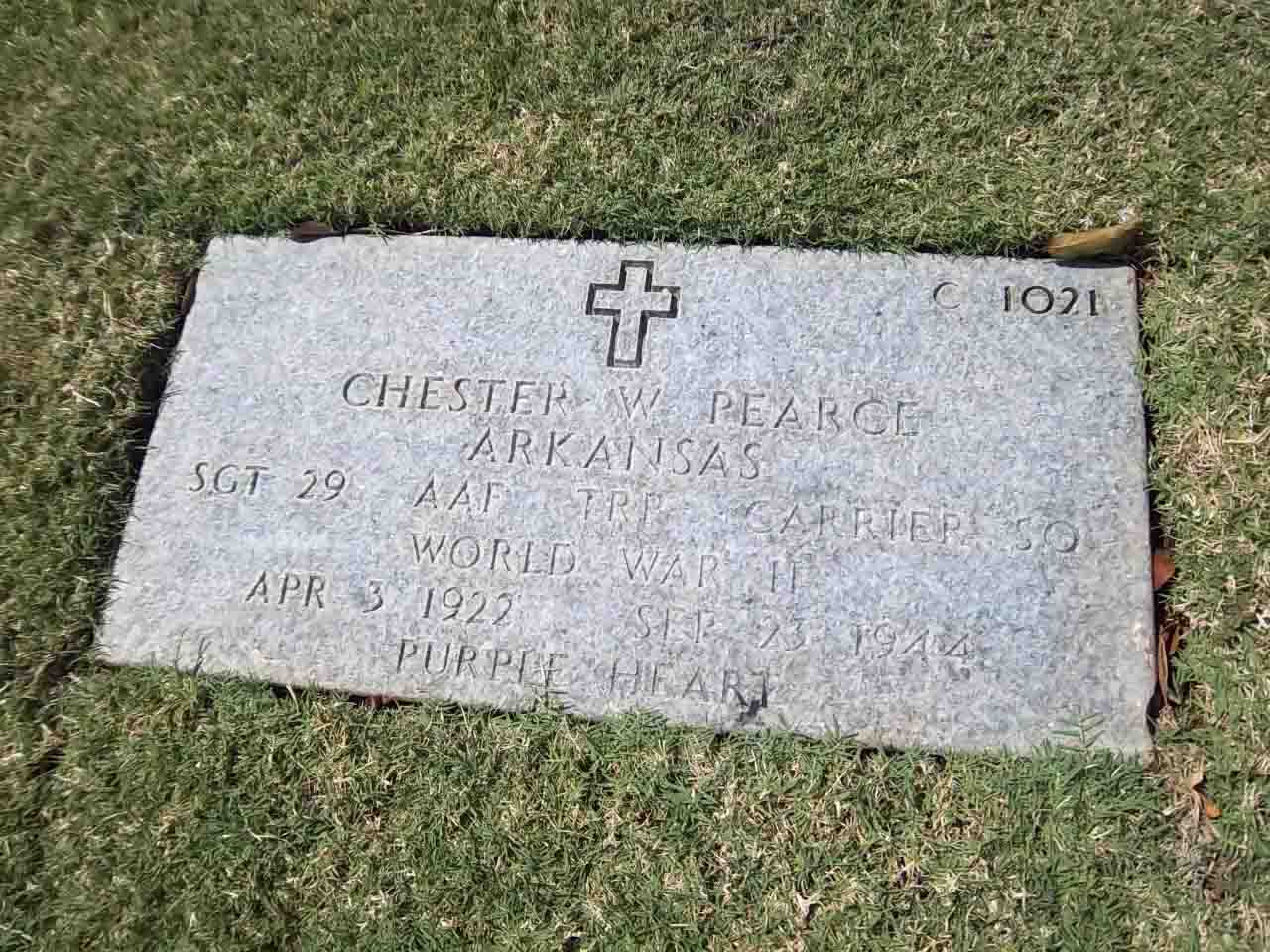 Chester W. Pearce was born on April 3, 1922. He was the son of Charlie W. Pearce and Charlie W. Pearce. Chester served in the 29th Troop Carrier Squadron as a Sergeant and food kicker in an aircraft during World War II. He died on September 23, 1944 at the age of 22 and is now buried in the National Memorial Cemetery of the Pacific, Honolulu, Honolulu County, Hawaii, USA. Sgt Pearce was one of over 2000 Americans who lost their lives defending China from their Japanese invaders from 1941-1945. He is commemorated on the The Monument to the Aviation Martyrs in the War of Resistance Against Japan in Nanjing, China.