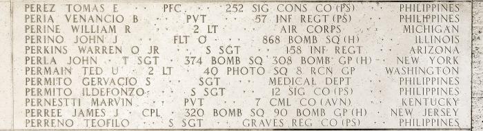 Tsgt Perla is commemorated on the Walls of the Missing, Manila American Cemetery, Taguig City, Philippines. He was one of over 2000 Americans who lost their lives defending China from their Japanese invaders from 1941-1945. He also is commemorated on the The Monument to the Aviation Martyrs in the War of Resistance Against Japan in Nanjing, China.