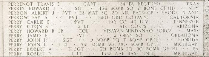 1Lt Perry was one of over 2000 Americans who lost their lives defending China from their Japanese invaders from 1941-1945. He is also commemorated on the The Monument to the Aviation Martyrs in the War of Resistance Against Japan in Nanjing, China. He also has a cenotaph located in Riverside Cemetery, Alma, Gratiot County, Michigan.