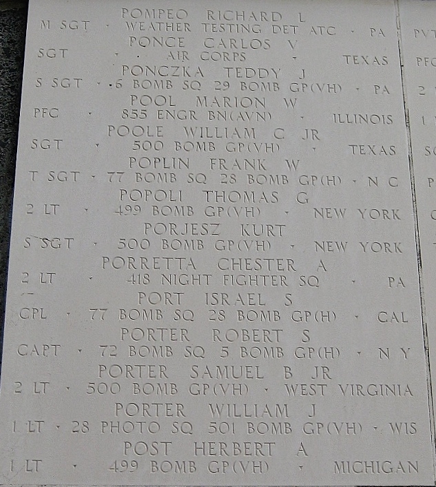 Samuel B. Porter, Jr. entered the military service in West Virginia. He served in the 882nd Bomber Squadron, 500th Bomber Group, Very Heavy as a Second Lieutenant and Co-Pilot of an aircraft during World War II. He was declared "Missing in Action" on January 23, 1945 and is commemorated on the Walls of the Missing, Manila American Cemetery, Taguig City, Philippines. Second Lieutenant Porter was one of over 2000 Americans who lost their lives defending China from their Japanese invaders from 1941-1945. He is also commemorated on the The Monument to the Aviation Martyrs in the War of Resistance Against Japan in Nanjing, China.