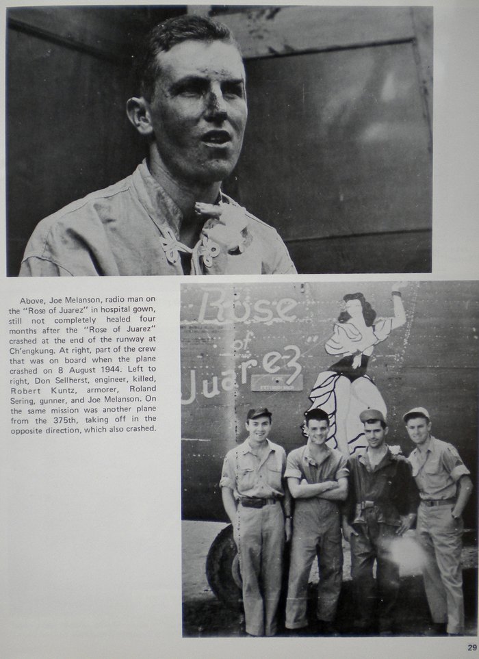 Donald J. Sellhorst was born in 1923 in Nebraska. He served in the 375th Bomber Squadron, 308th Bomber Group, Heavy as a Staff Sergeant and an Engineer of an aircraft during World War II. He was the Flight Engineer of B-24J #42-73305 'Rose of Juarez', which crashed at the end of the runway at Chengkung, Yunnan, China upon takeoff on a bombing mission 13 July 1944. Ssgt Sellhorst is now buried in the Saint Mary Cemetery, Saint Bernard, Hamilton County, Ohio, USA. He was one of over 2000 Americans who lost their lives defending China from their Japanese invaders from 1941-1945. He is commemorated on the The Monument to the Aviation Martyrs in the War of Resistance Against Japan in Nanjing, China.