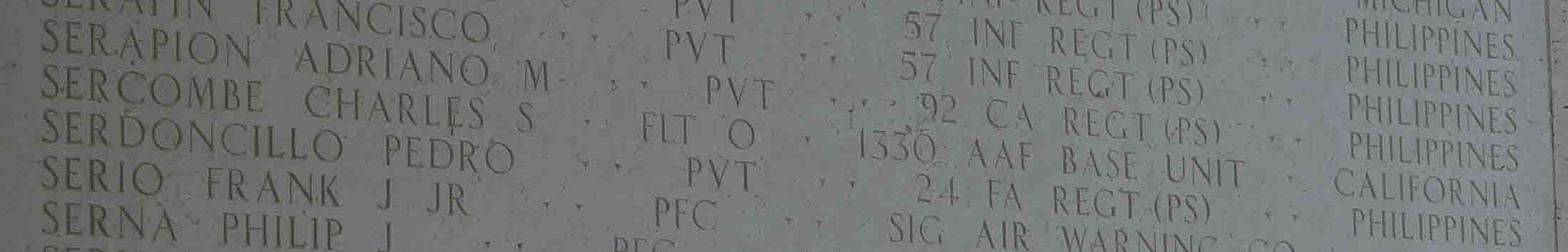 Charles S. Sercombe entered the military service in California. He served in the 1330th Army Air Force Base Unit as a Flight Officer and Co-Pilot of an aircraft during World War II. He went missing on August 6, 1945 and was officially declared dead on August 7, 1946. F/O Sercombe is honored on the Walls of the Missing, Manila American Cemetery, Taguig City, Philippines. He was one of over 2000 Americans who lost their lives defending China from their Japanese invaders from 1941-1945. He is commemorated on the The Monument to the Aviation Martyrs in the War of Resistance Against Japan in Nanjing, China.