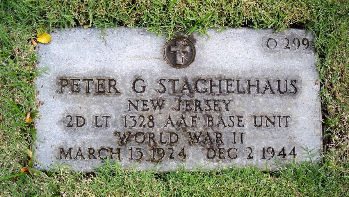 Peter G. Stachelhaus was born on March 13, 1924. He served in the 1328th Army Air Force Base Unit as a Second Lieutenant and Co-Pilot of an aircraft during World War II. He died on December 2, 1944 at the age of 20 and is now buried in the National Memorial Cemetery of the Pacific, Honolulu, Honolulu County, Hawaii, USA. 2Lt Stachelhaus was one of over 2000 Americans who lost their lives defending China from their Japanese invaders from 1941-1945. He is commemorated on the The Monument to the Aviation Martyrs in the War of Resistance Against Japan in Nanjing, China.