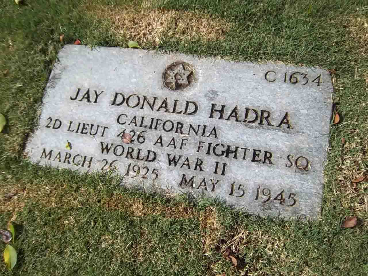 Jay Donald Hadra was born on March 26, 1925. He served in the 425th Bomber Squadron, 308th Bomber Group as a Second Lieutenant during World War II. He died on May 15, 1945 at the age of 20 and is now buried in the National Memorial Cemetery of the Pacific, Honolulu, Honolulu County, Hawaii, USA. 2Lt Hadra was one of over 2000 Americans who lost their lives defending China from their Japanese invaders from 1941-1945. He is commemorated on the The Monument to the Aviation Martyrs in the War of Resistance Against Japan in Nanjing, China but death date is inscribed as 1945-05-05.