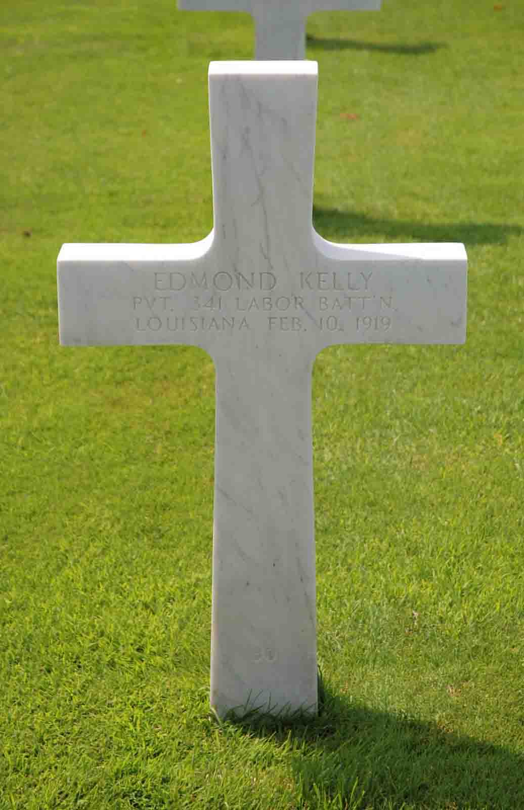 Edmond Kelly entered the military service in Louisiana. He served in the 341st Quartermaster Labor Battalion as a Private during World War I. Pvt Kelly died on February 10, 1919 and is now buried in the St. Mihiel American Cemetery, Thiaucourt, France.