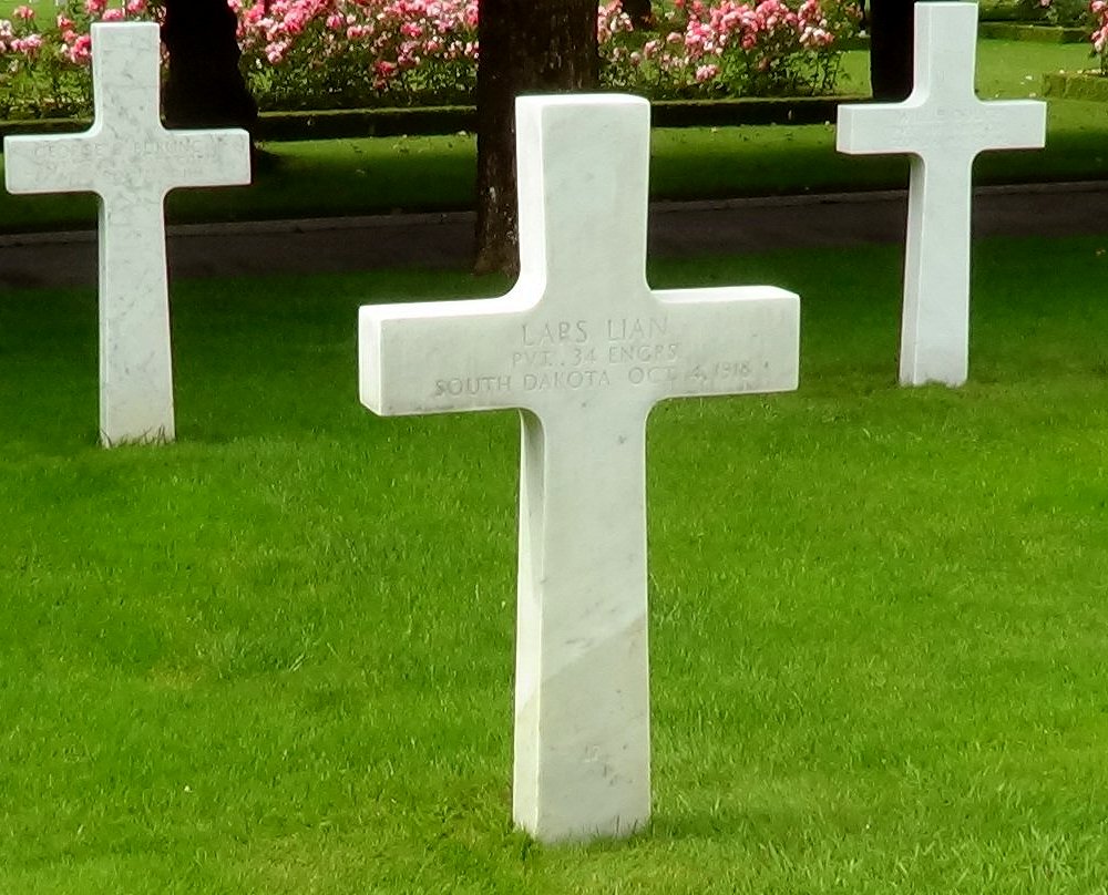 Lars Lian entered the military service in South Dakota. He served in the 34th Engineer Regiment as a Private during World War I. Pvt Lian died on October 4, 1918 and is now buried in the St. Mihiel American Cemetery, Thiaucourt, France.
