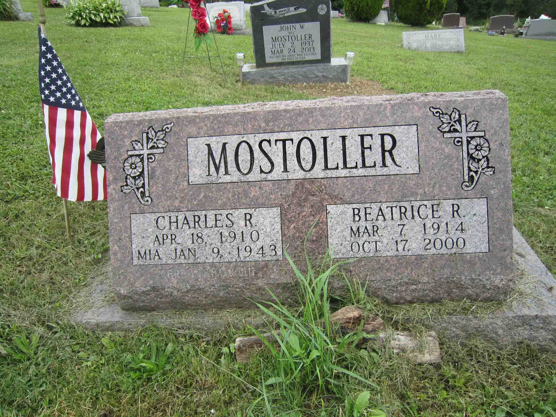 Charles Robert Mostoller, Sr. was born on April 18, 1910 in Quemahoning Township, Somerset County, Pennsylvania. He was the son of Webster Xerxes Mostoller and Gladys Nevada Miller Mostoller. He served in the US Air Corps as a Captain and Pilot of an aircraft during World War II. He died on January 9, 1943 at the age of 32 in Myanmar and is now buried in the IOOF Cemetery, Stoystown, Somerset County, Pennsylvania, USA.