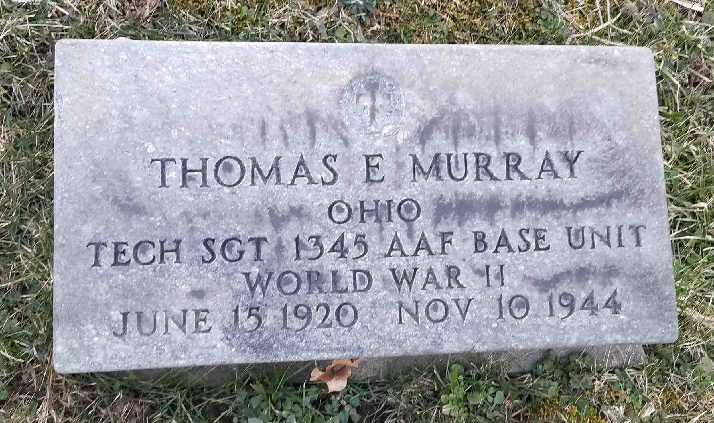 Thomas Edward Murray was born on June 15, 1920 in Belmont County, Ohio. He was the son of Michael Edward Murray and Martha Katherine Myers Murray. He served in the 1345th Army Air Force Base Unit as a Technical Sergeant during World War II. He died on November 10, 1944 at the age of 24 in India and is now buried in the Mount Calvary Cemetery, Bellaire, Belmont County, Ohio, USA. Tsgt Murray was one of over 2000 Americans who lost their lives defending China from their Japanese invaders from 1941-1945. He is commemorated on the The Monument to the Aviation Martyrs in the War of Resistance Against Japan in Nanjing, China.