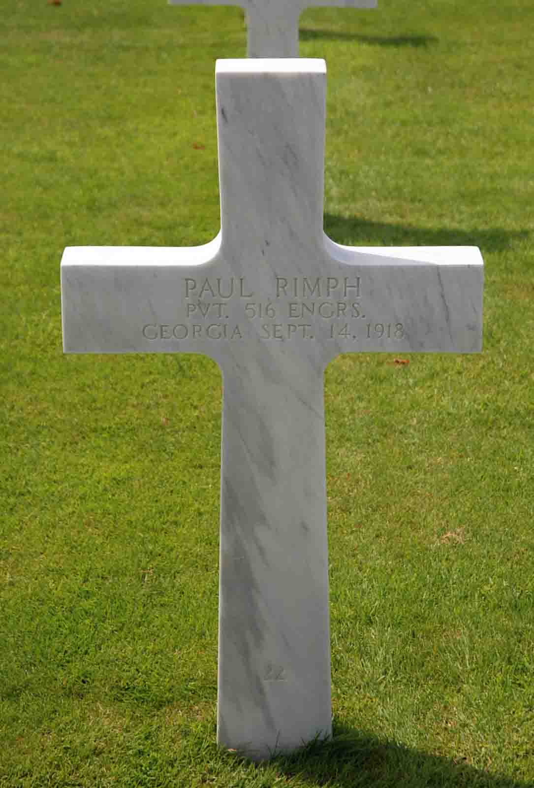 Paul Rimph entered the military service in Georgia. He served in the 516th Engineer Regiment as a Private during World War I. He died on September 14, 1918 and is now buried in the St. Mihiel American Cemetery, Thiaucourt, France.