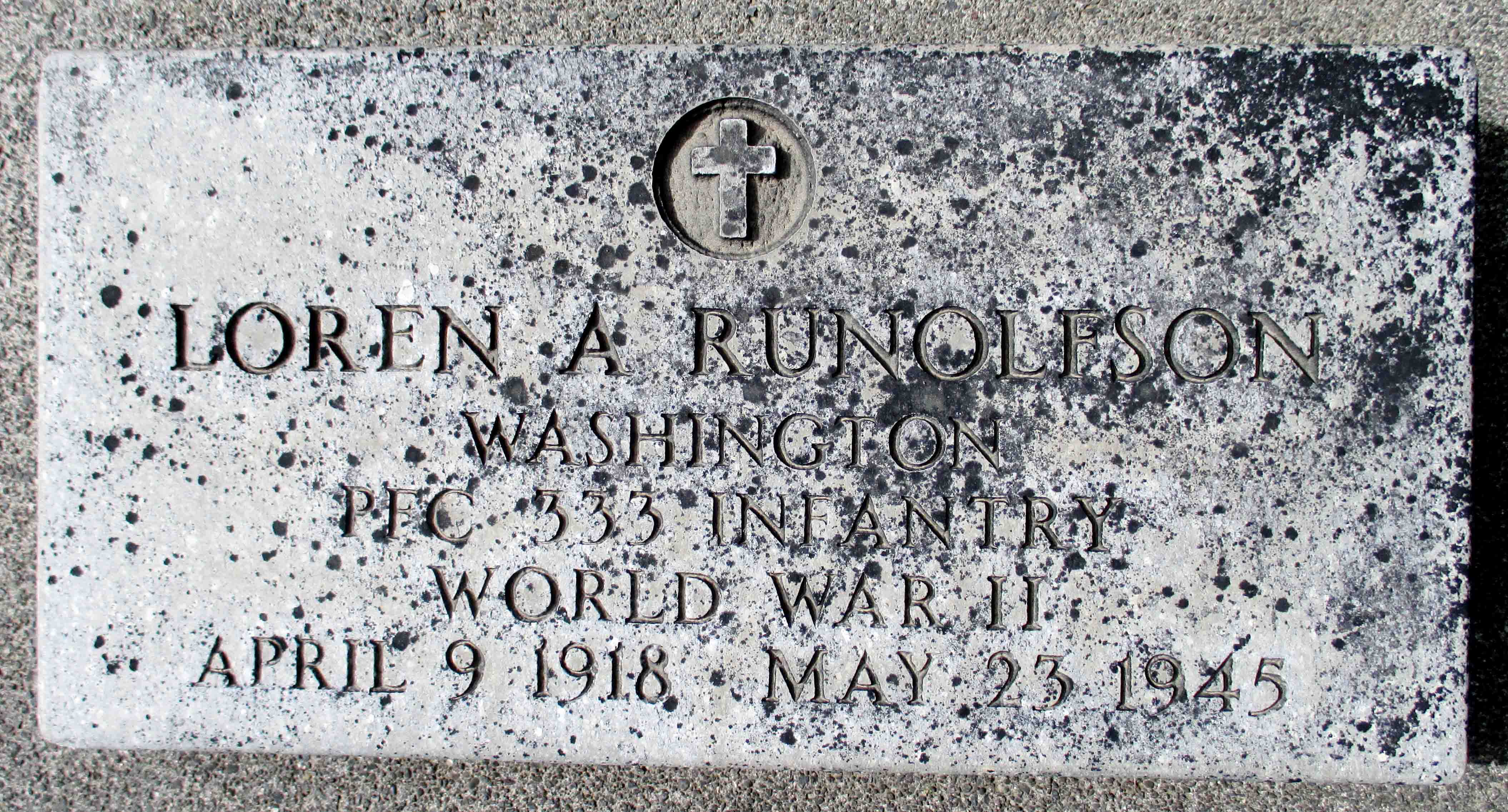 Loren Allen Runolfson was born on April 9, 1918 in Brown County, Nebraska. He served in the 333rd Infantry Regiment, 84th Infantry Division as a Private First Class during World War II. On May 23, 1945, he was a passenger on Flight C-46D (4-77507) which was taking 41 American soldiers that were ill, injured, or repatriated prisoners of war to hospitals in the Paris, France area and was then eventually going to take them all back to the United States. This flight occurred after Germany's surrender on May 7, 1945. However this C-46, for unknown reasons, developed a fire in one of it's two engines and crashed near the village of Taillefontaine, near Paris. All men aboard were killed in the crash. PFC Runolfson died at the age of 27 and is now buried in the Mountain View Cemetery, Walla Walla, Walla Walla County, Washington, USA.