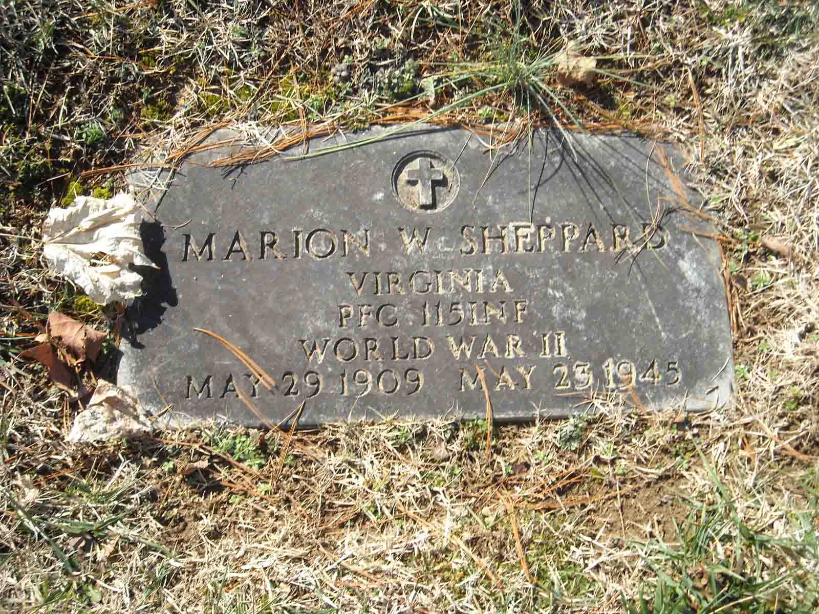 Marion Walter Sheppard was born on May 29, 1909 in Washington County, Virginia. He was the son of Shady H. Sheppard and Rilda M. Winebarger Sheppard. Marion served in the 115th Infantry Regiment as a Private First Class during World War II.