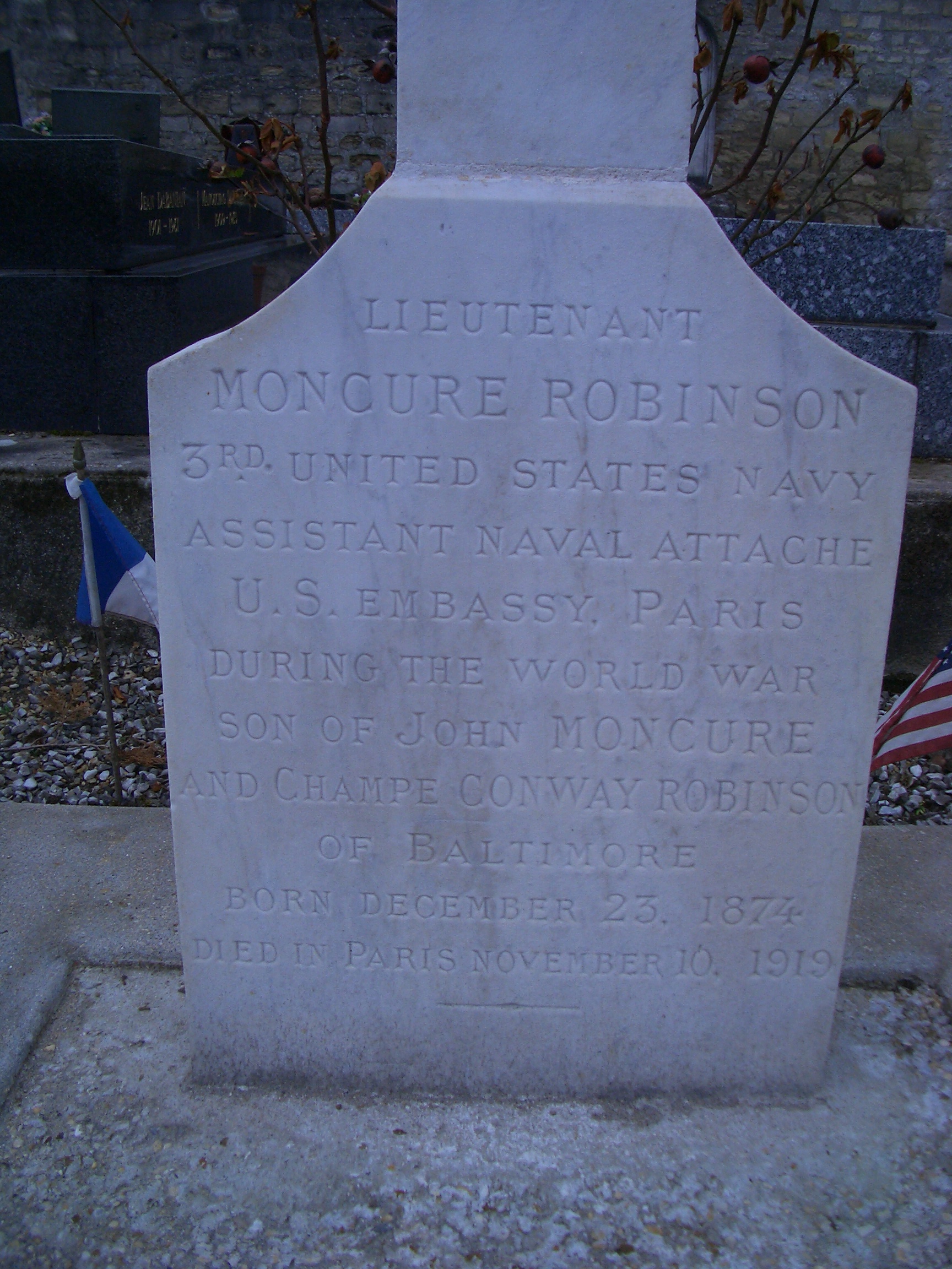 Born on 23 December 1874 to Colonel John Moncure Robinson (1835-1893) and Maria Champe Conway Robinson (1847-1901). Served as the assistant Naval Attache in the US Embassy in Paris during World War I. Died in Paris on 10 November 1919 and is buried in the Old Communal Cemetery in St Germain en Laye, France.